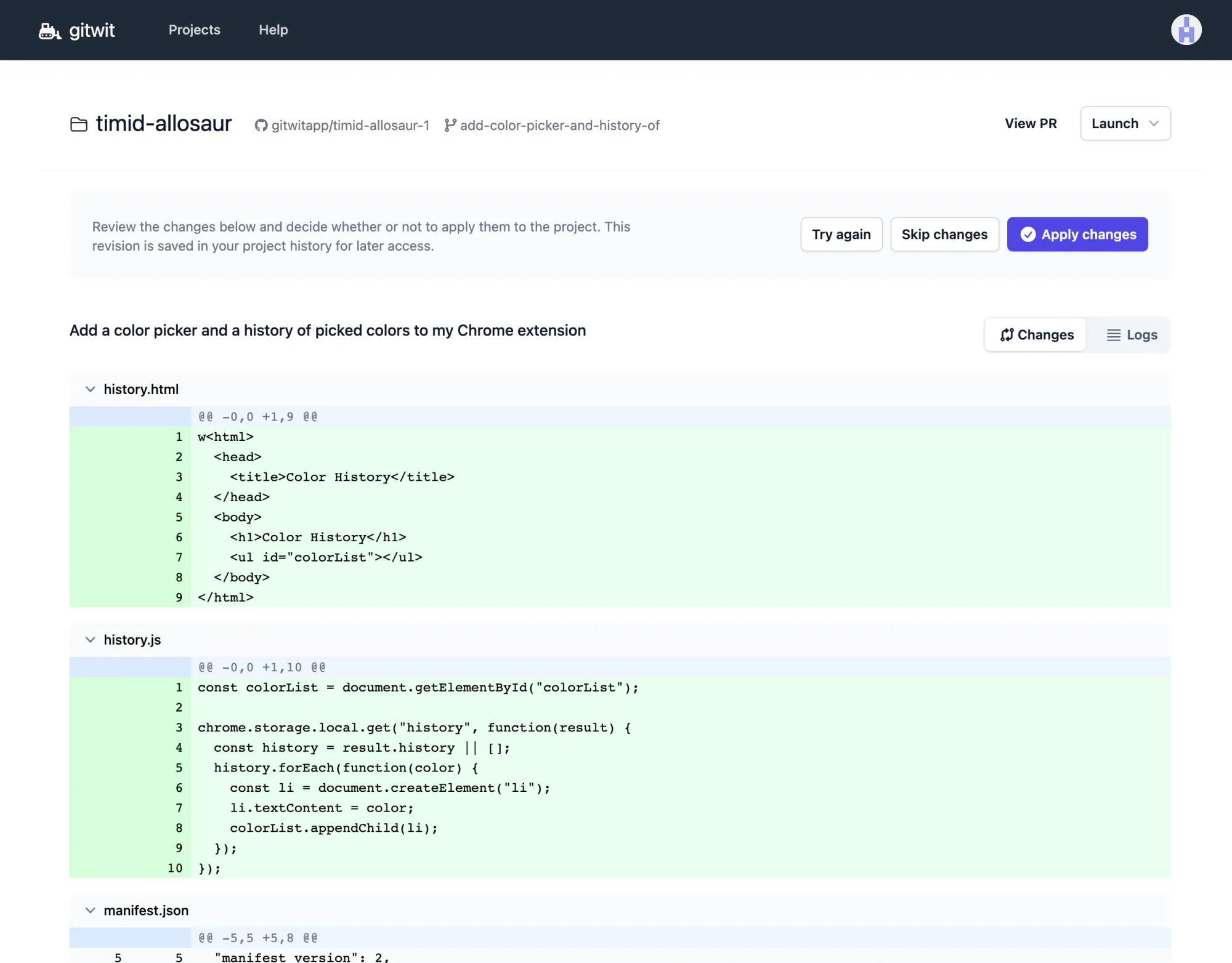 Upon clicking the button, you will be led to the revision screen, where you can type in your prompt. In this case, we're telling GitWit to add a color picker and a history of picked colors to our extension.