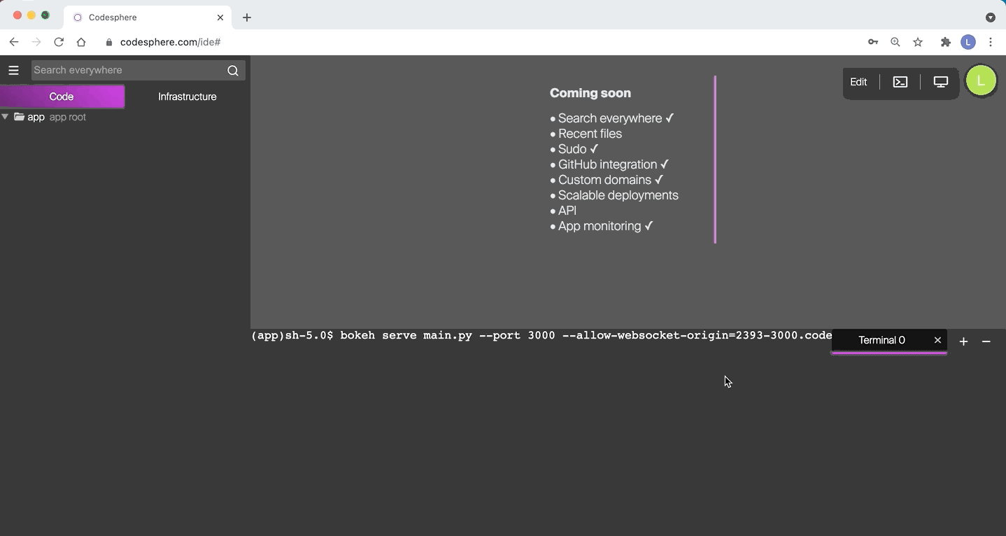 Alternatively, here is the starter project above ready to deploy from Codesphere (Don’t forget to enter your virtual environment and install Bokeh!):