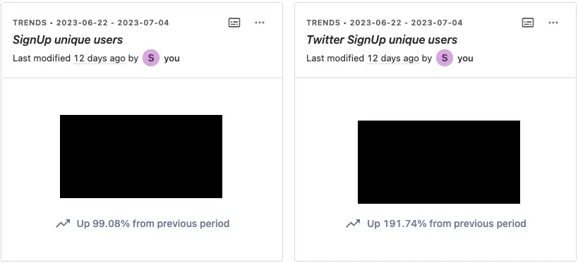 Up next I always put the absolute / unique user values that we are currently trying to optimize alongside how it changed to the previous period (usually last 14 days vs. last 14 days before that). Again always checking what actionable insights this might provide: These tell me the overall health of what we are trying to achieve, also it's great to challenge the team to try and hit weekly goals based on these.