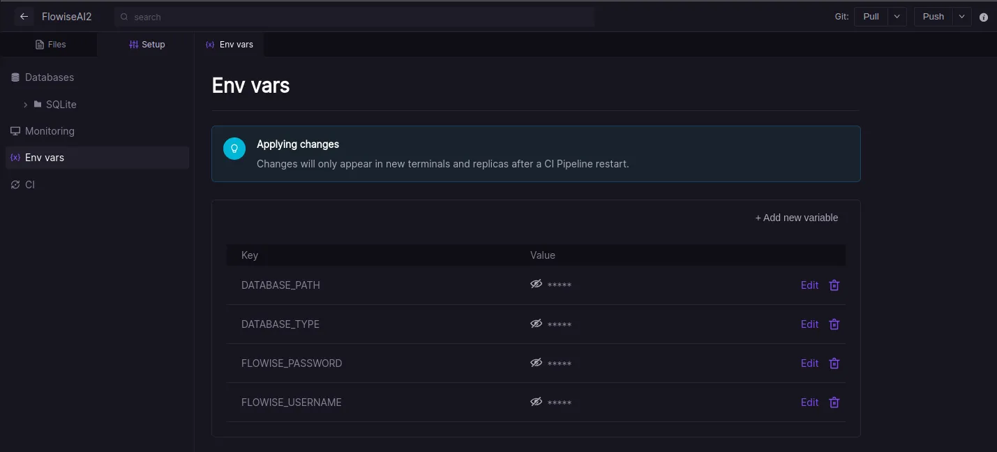 Meanwhile, while the Prepare stage is executing, you can set up the database credentials as environment variables on Codesphere. FlowiseAI saves all application data in a single database, supporting either MySQL, PostgreSQL, or SQLite. In this example, we will use a SQLite Database. However, if you prefer MySQL or PostgreSQL, you can easily obtain one from the marketplace in your Codesphere team. Additionally, we will set up a username and a password for this application to ensure that only authorized users can access it.