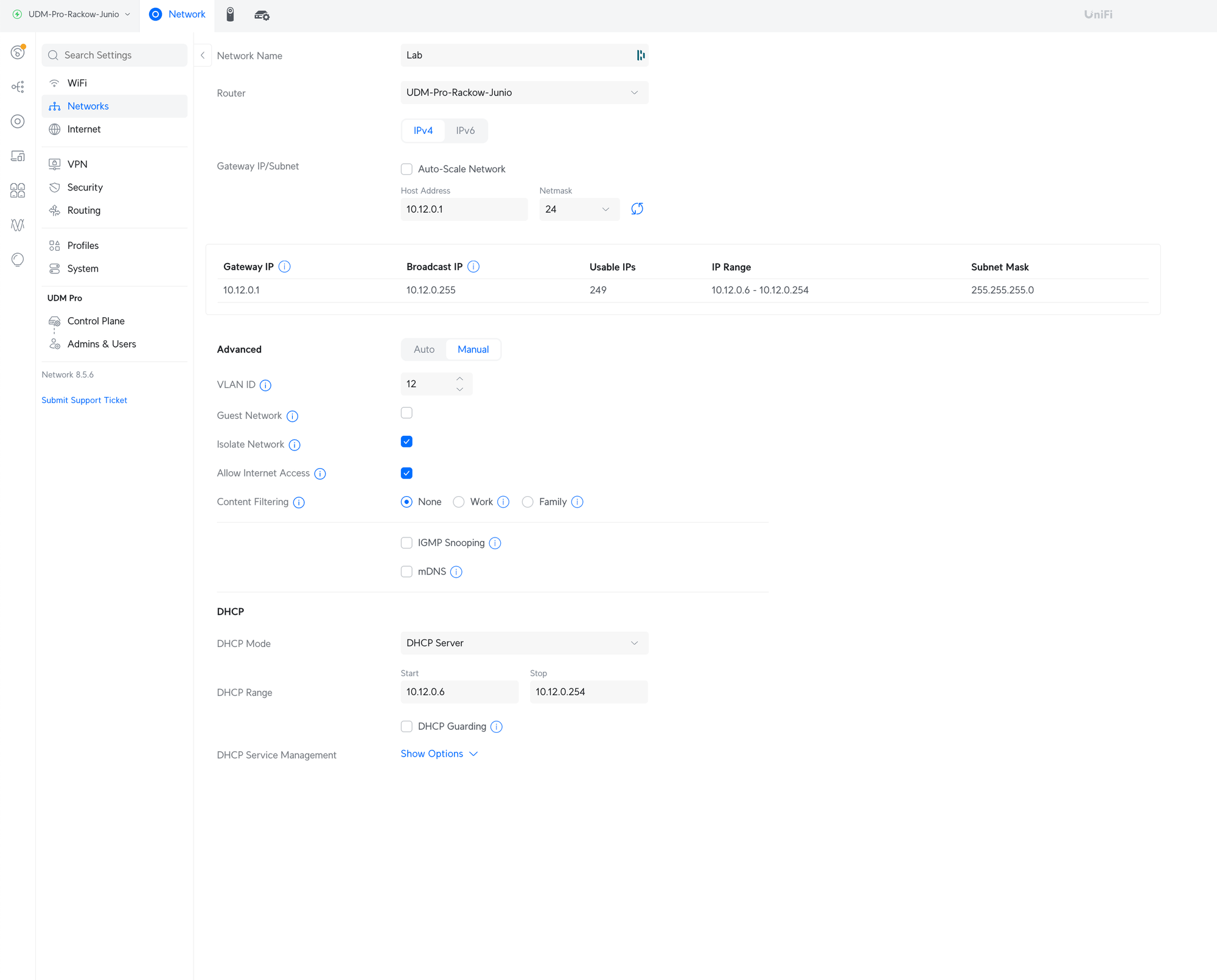 As mentioned I'm using a Unifi Dream Machine Pro and the 8-port switch. I created a new network called "lab" for this purpose and set it to be isolated. I do appreciate that Unifi gives you that option out of the box so you don't have to fiddle around with the firewall rules but can just get it done.