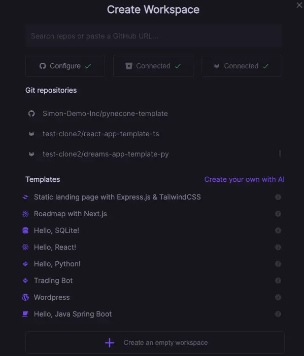 You can also connect an existing account to GitLab - it only takes a few clicks. Once connected, you can browse your GitLab repositories in the create workspace dialog.