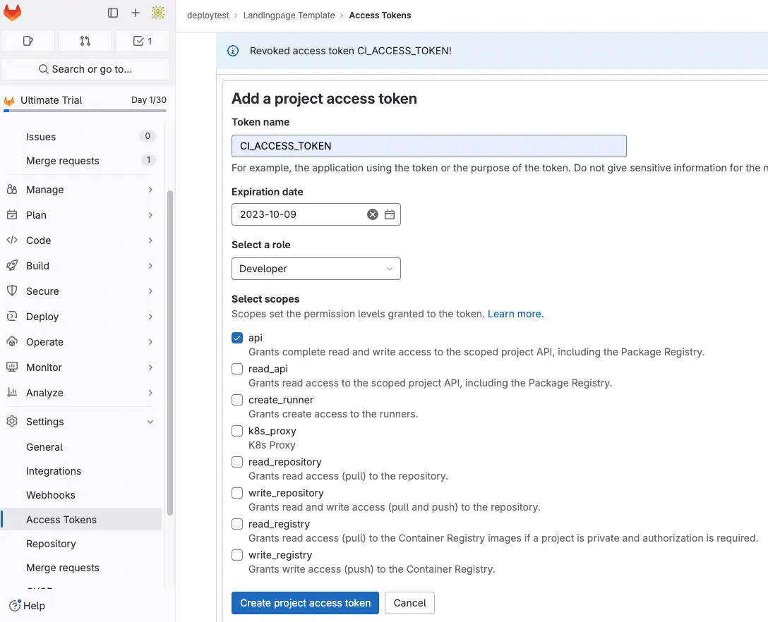 CI_ACCESS_TOKEN (*) | The access token you created for the repository. It is recommended to use a secure repository variable. |