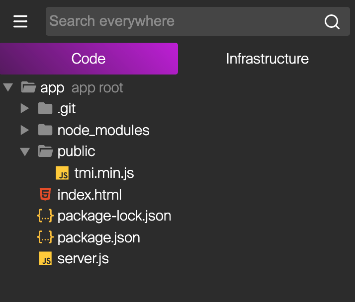 Once that is done, create server.js, index.html, and a public folder for us to put our TMI.js file in. Your file tree should look like this: