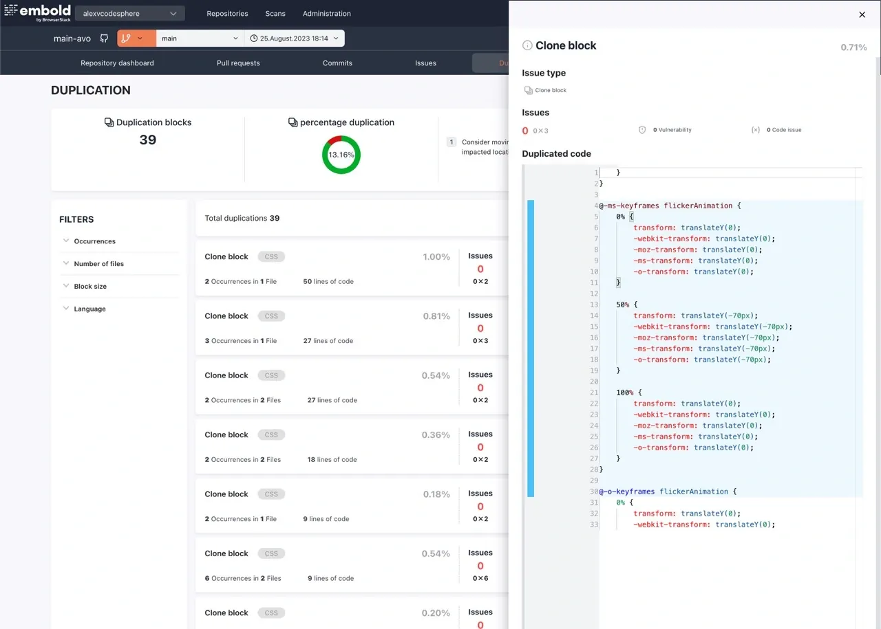 - Repository Insights: Beyond just code, Embold offers a bird's eye view of the entire project. Visual representations of the codebase structure, dependencies, and hotspots of change equip teams to make informed decisions.