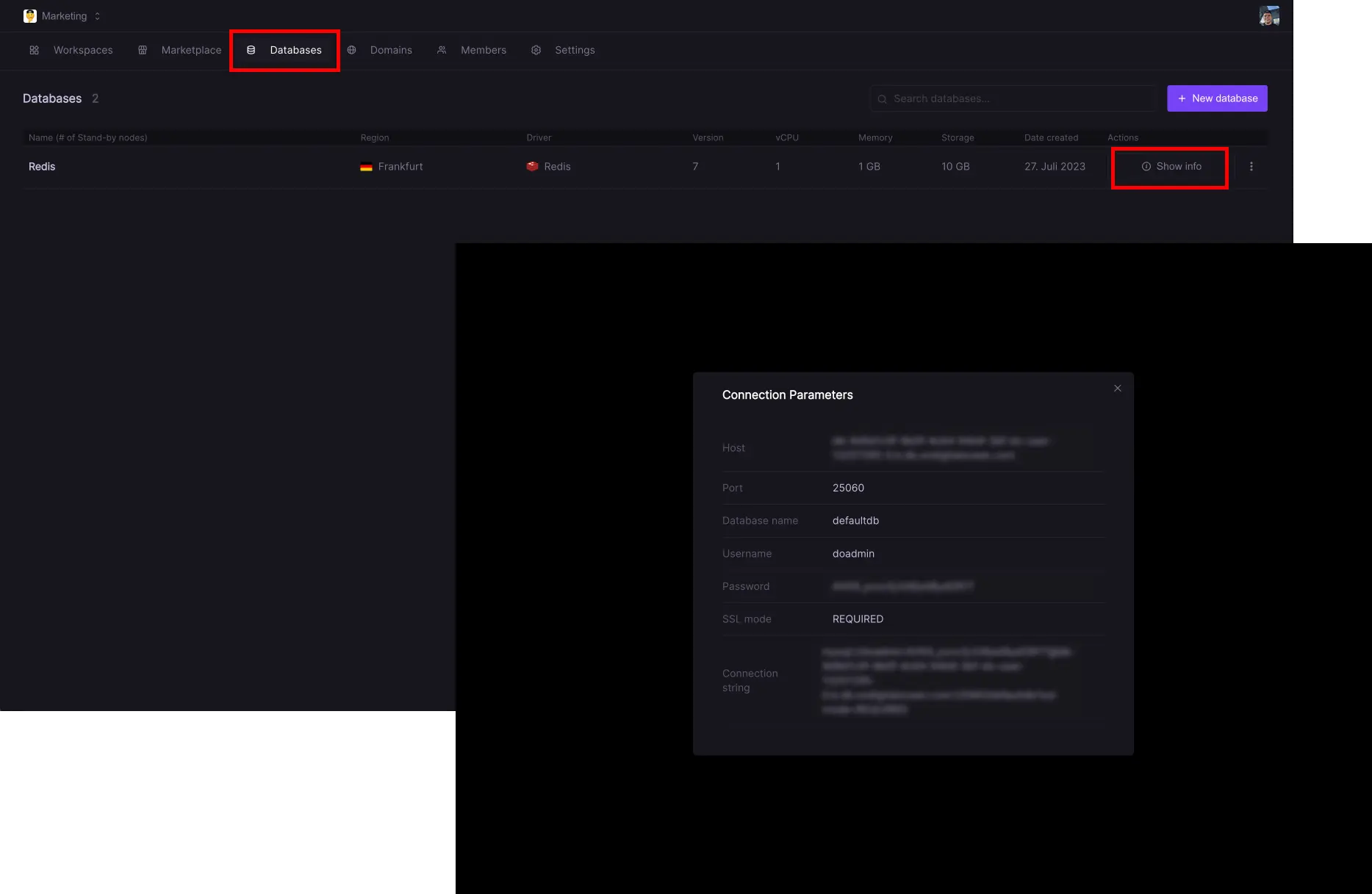Your database will then be created. This will take several minutes depending on the configuration. Please be patient until the creation is finished. You can check the status of your database from your Dashboard as well under the Databases tab. Once the process has finished, you will be able to access your database's Connection Parameters by clicking Show info.