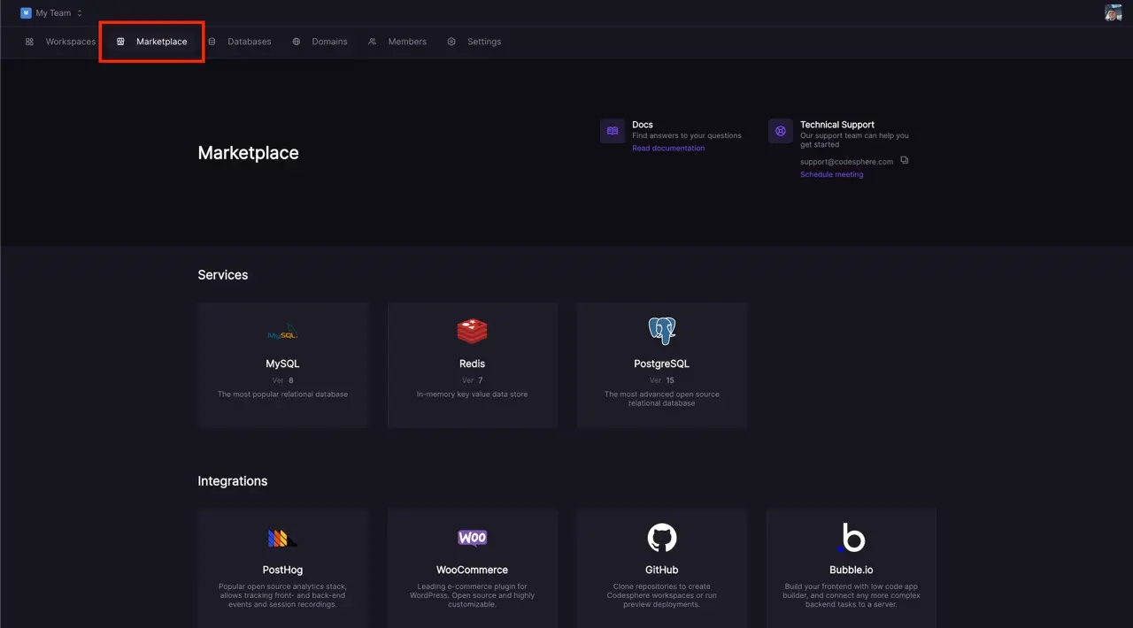 Redis integration is available as a managed service right inside of Codesphere through the Marketplace. You can access it from your Dashboard by clicking the the Marketplace tab.