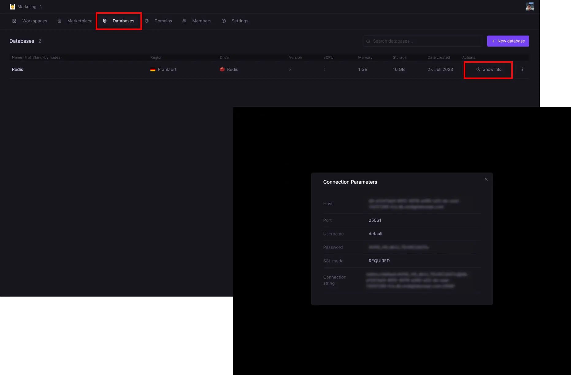 Your database will then be created. This will take several minutes depending on the configuration. Please be patient until the creation is finished. You can check the status of your database from your Dashboard as well under the Databases tab. Once the process has finished, you will be able to access your database's Connection Parameters by clicking Show info.