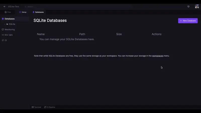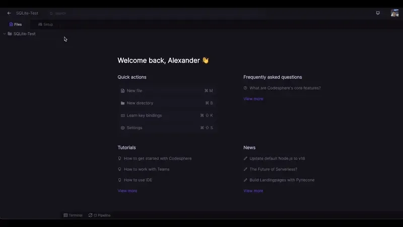 Other than our other databases, SQLite is not available as a managed service in our Marketplace. Instead, you can create a SQLite database right inside your project. You can do this right from the Codesphere UI without writing a single line of code.