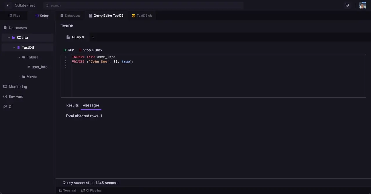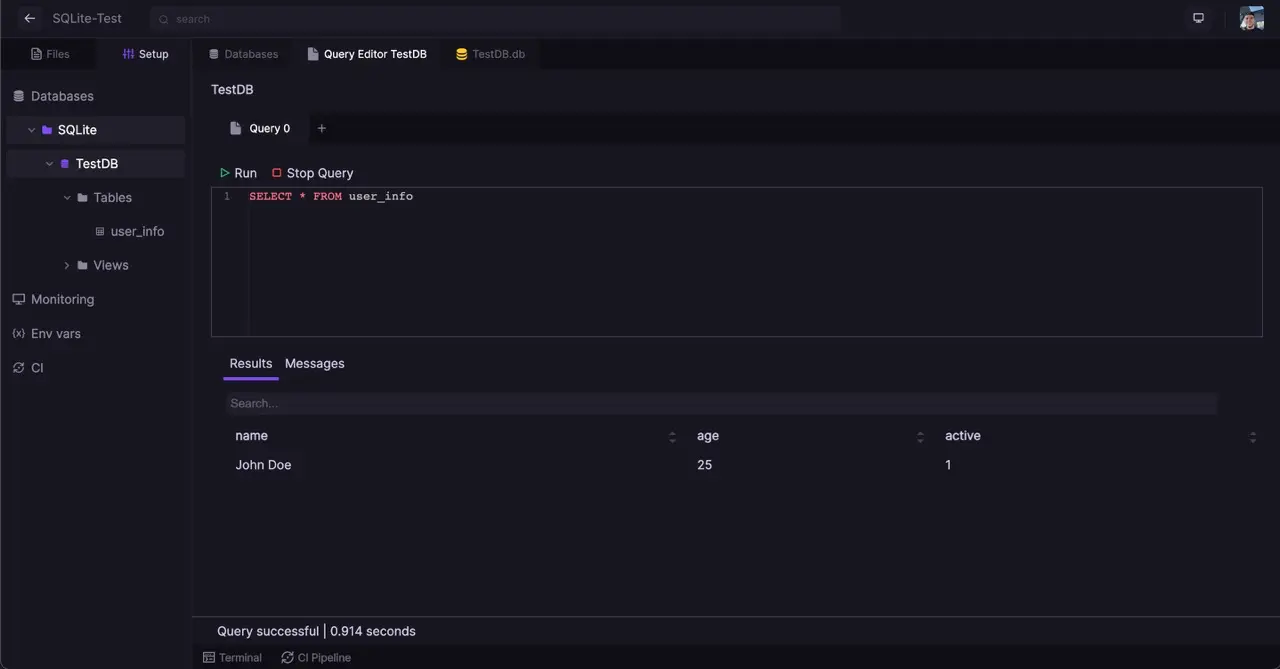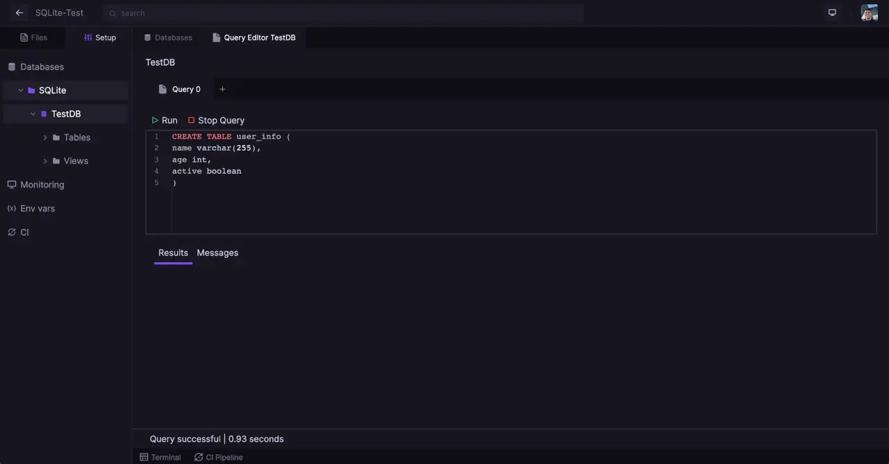 The Query Editor will allow you to easily run SQL queries right from the Codesphere UI. You can use it to make ad-hoc insertions and deletions, view data, set up and organize tables.
