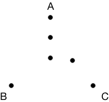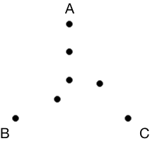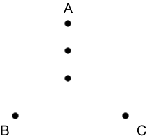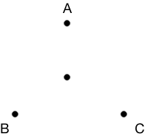 The chaos game begins by drawing three corners of a triangle, and a point in the center of the triangle. We’ll label our corners A, B, and C.