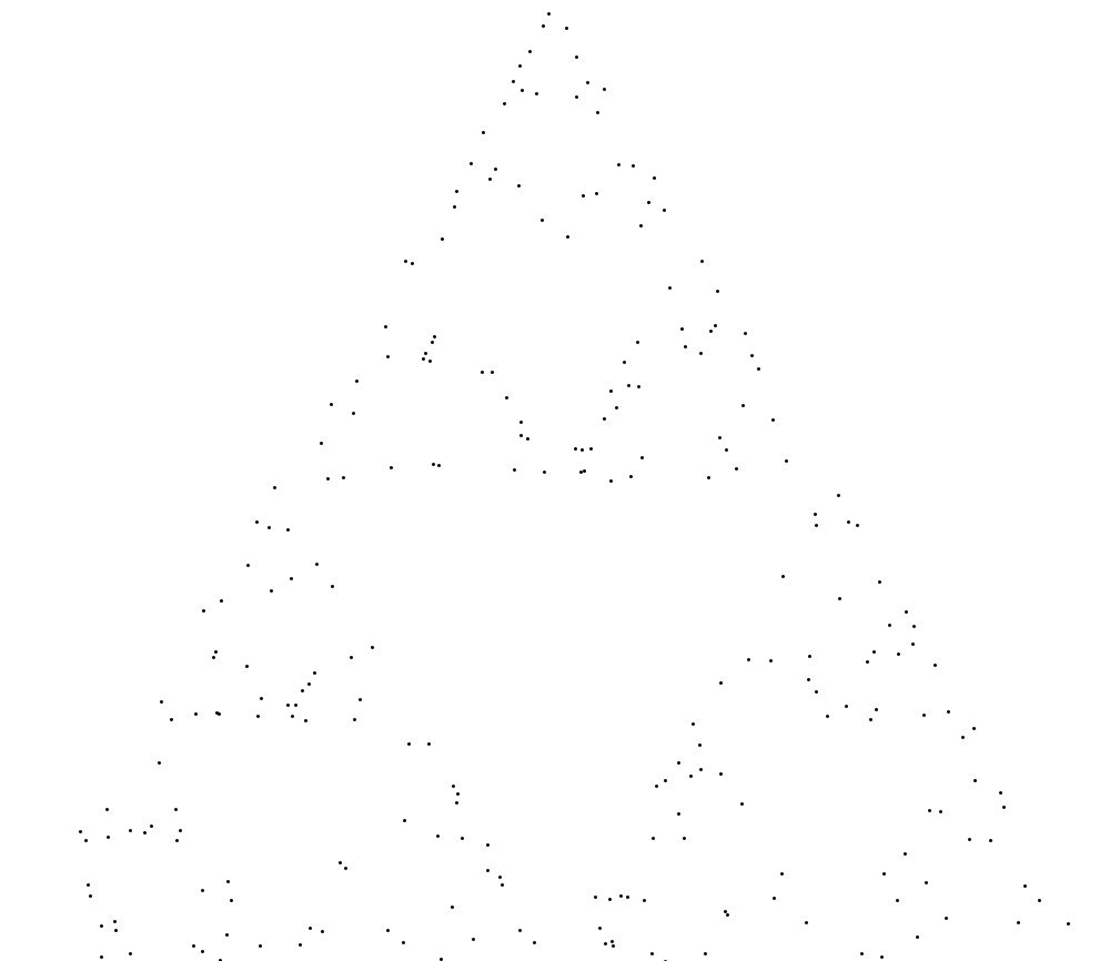 The Chaos Game is interested in what occurs if you repeat this process continually. Will the entire triangle be filled up? Will the points be concentrated around the edges? Since we are picking the corners at random, maybe there will be no pattern at all?
